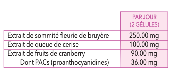 Ingrédients : extrait de sommité fleurie de bruyère (Callunavulgaris (L.) Hull.) (Origine EU) ; enveloppe de la gélule : hydroxypropylméthylcellulose ; anti-agglomérant : carbonate acide de magnésium ; agent de charge : cellulose microcrystalline / gel cellulosique ; extrait de queue de cerise (Cerasus Vulgaris Mill) (Origine EU) ; extrait de fruit de cranberry (Vaccinium macrocarpon Aiton) (Origine hors U.E) ; anti-agglomérant : sels de magnésium d’acides gras.